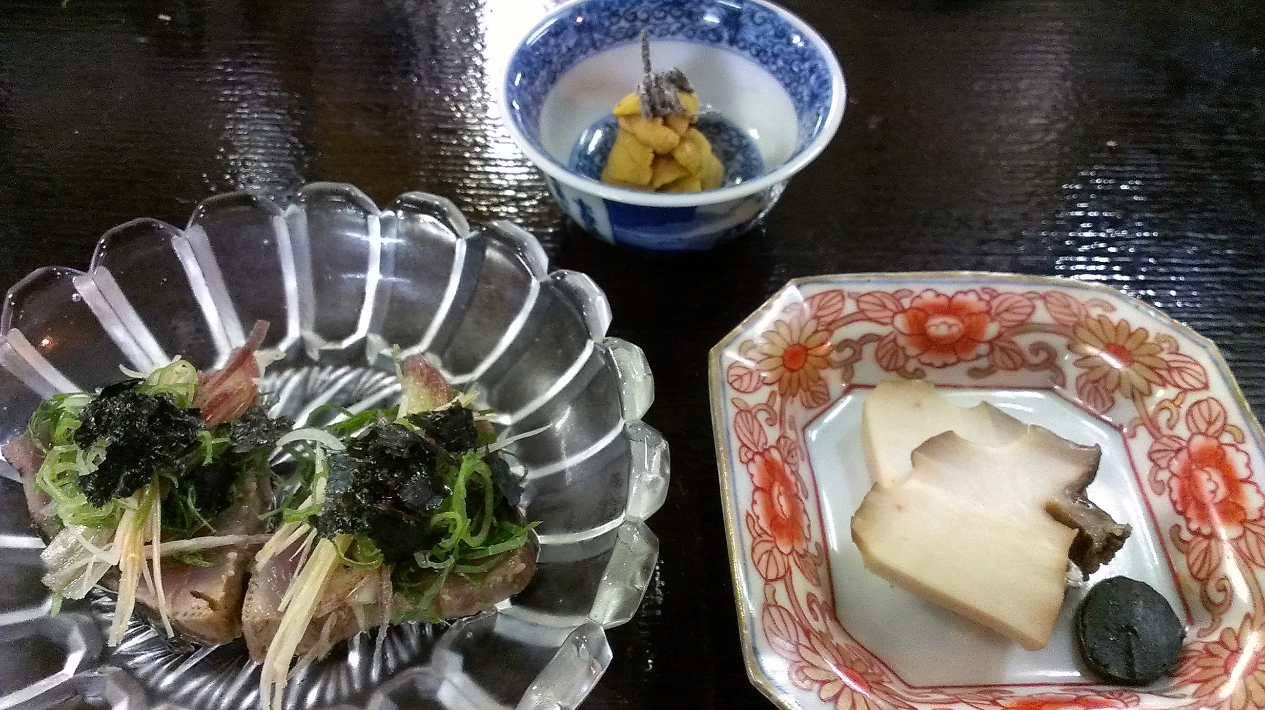 <蒸し鮑・赤雲丹・鰹の叩き>