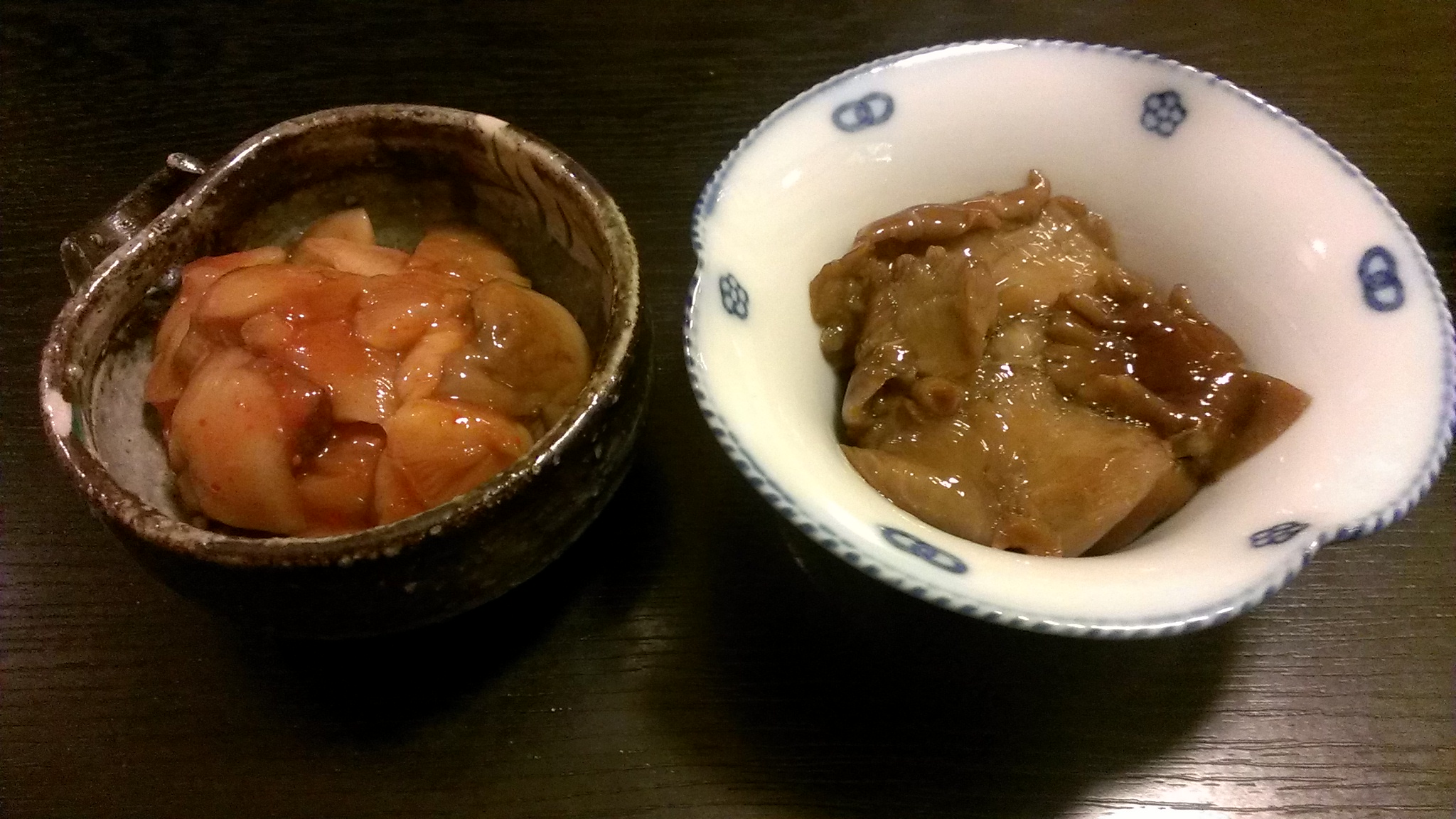 今回頂いたキノコは、写真左がヌメリスギタケのキムチ和え。写真右がチャナメツチタケをお醤油で炊いた物。