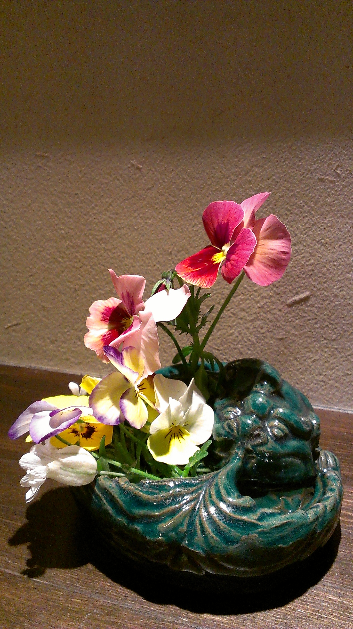 写真は、青釉獅子型筆洗(19世紀)に花を生けてみました。