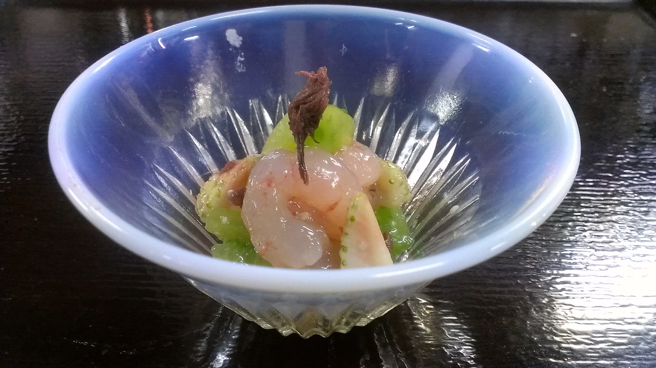 今週オススメの料理は「甘海老とスウィートグリーンの桜和え」です。
